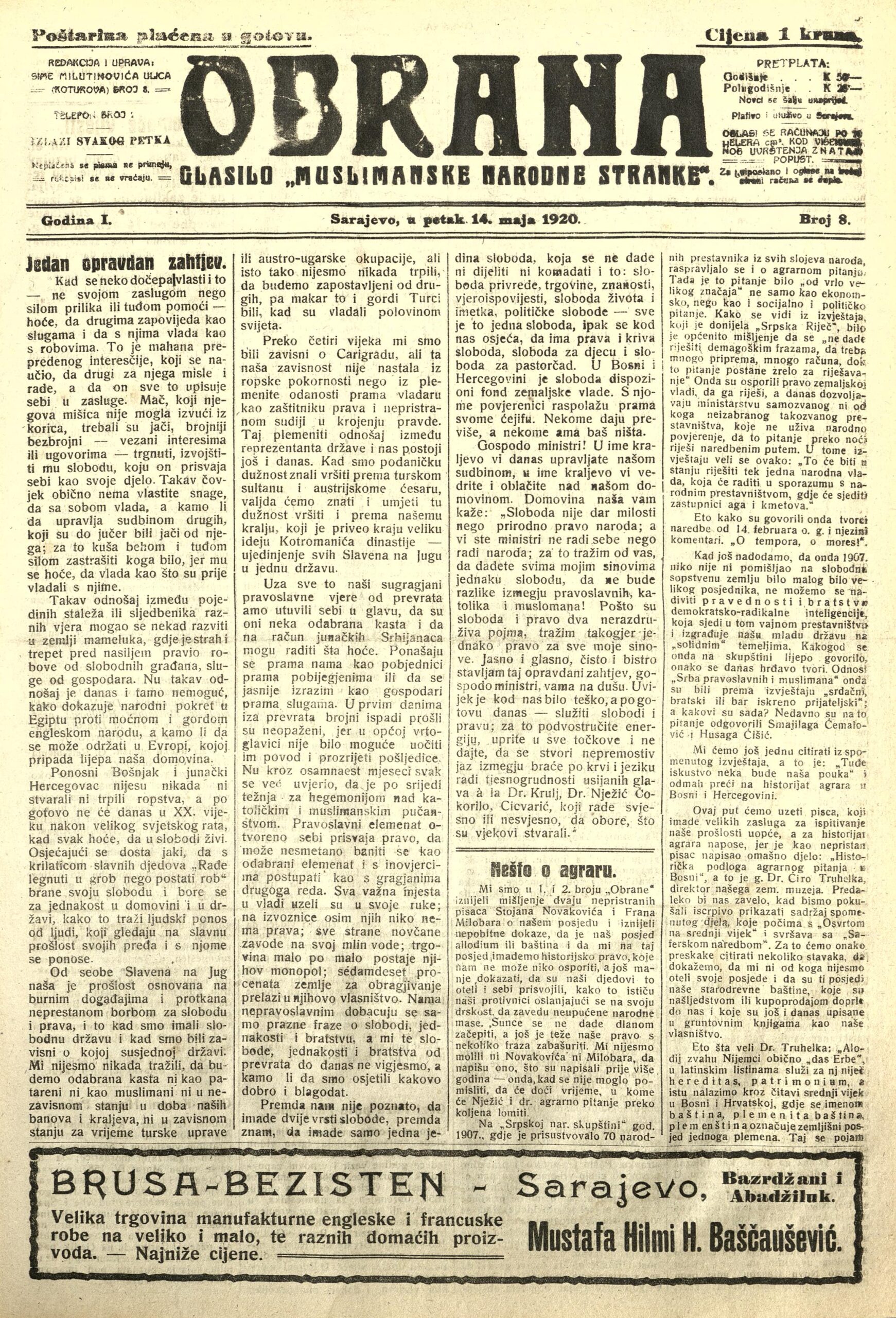 Obrana : glasilo Muslimanske narodne stranke God. I, br. 8Obrana : glasilo Muslimanske narodne stranke God. I, br. 8