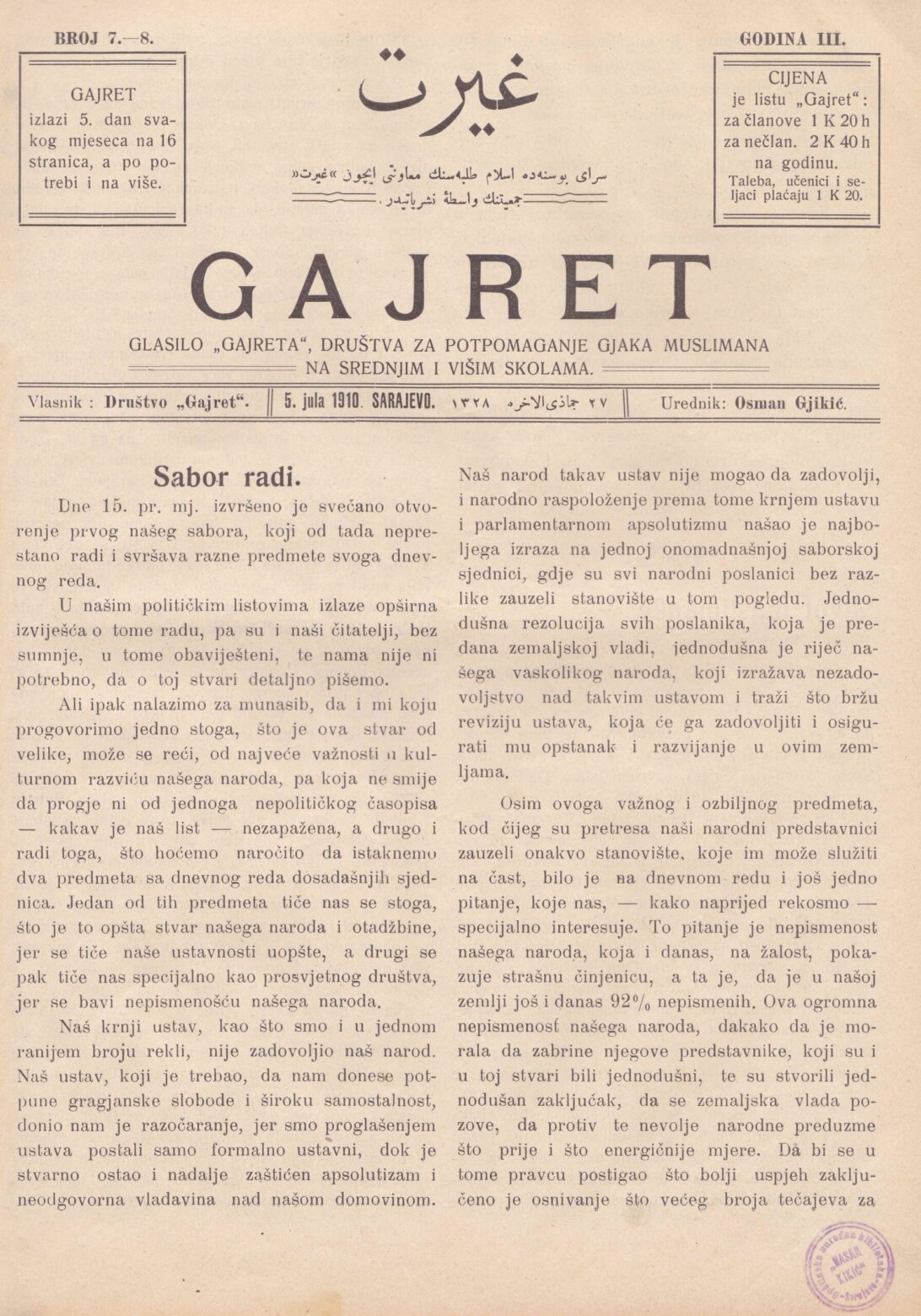 Gajret : glasilo “Gajreta”, društva za potpomaganje đaka muslimana na srednjim i višim školamaGajret : glasilo “Gajreta”, društva za potpomaganje đaka muslimana na srednjim i višim školama