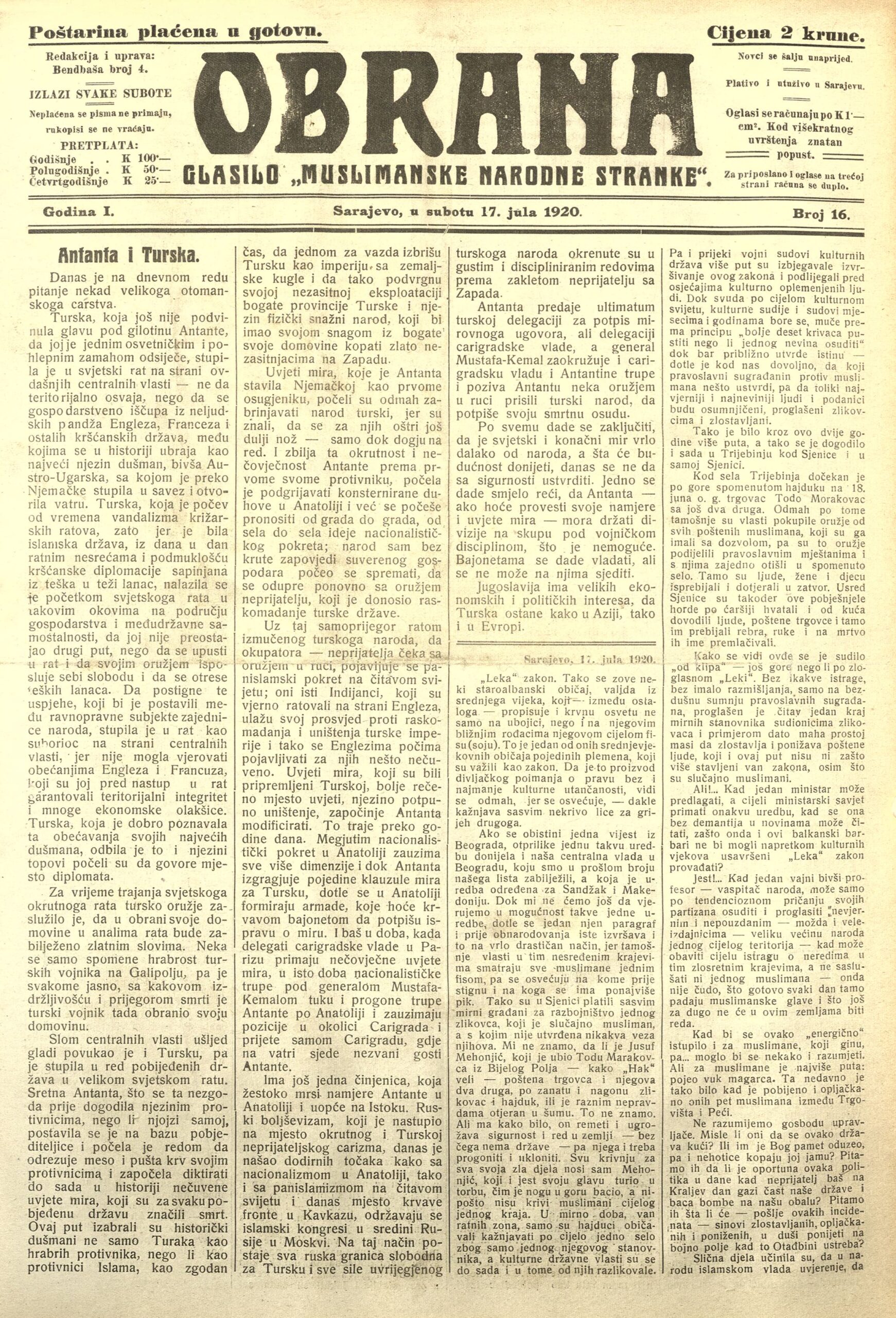 Obrana : glasilo Muslimanske narodne stranke God. I, br. 16Obrana : glasilo Muslimanske narodne stranke God. I, br. 16